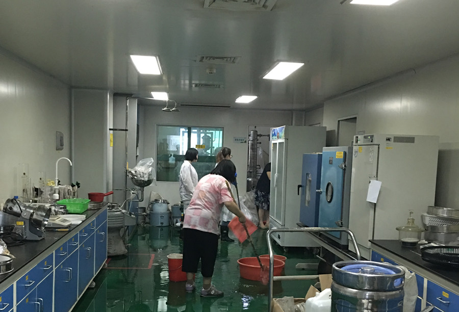 質(zhì)量小組匡艷輝經(jīng)理帶著御珠姐等人迅速將幾袋過期輔料充作沙包堵住門口,以防雨水再次大量涌入。這邊謝敏帶著詩(shī)韻等人一邊搶救地上的實(shí)驗(yàn)物品,一邊開展排澇工作。5樓同事聞?dòng)?,也紛紛趕來幫忙,大家充分發(fā)揮團(tuán)結(jié)協(xié)作的精神,紛紛掃水、拖地、鋪報(bào)紙、開風(fēng)機(jī),齊心協(xié)力迅速清理屋內(nèi)積水。明姐等人冒雨將原來放置在排水道內(nèi)便于運(yùn)貨小車通行的磚塊也進(jìn)行暫時(shí)性移除,清掃了部分排水溝內(nèi)的沙土,順利排澇。